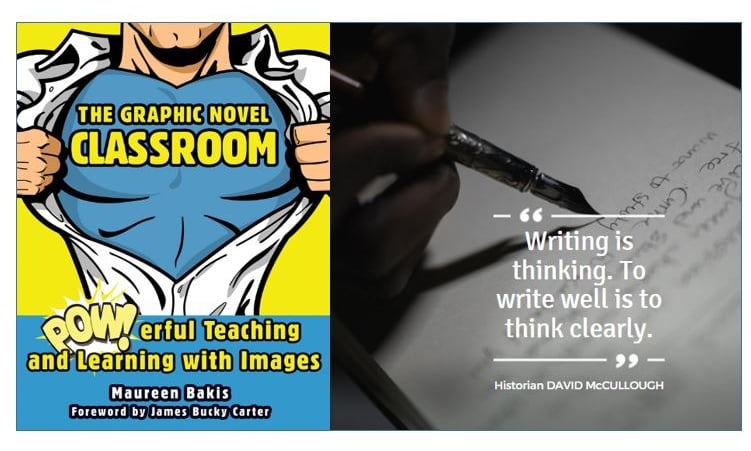 The thing about cartoony images (the cartoonier, the better, in fact) is that they make it easy for learners to envision themselves a scene, "which amplifies the overarching meaning of the story,” says Maureen Bakis, author of THE GRAPHIC NOVEL CLASSROOM: Powerful! Teaching & Learning with Images (Corwin Press; 2012).