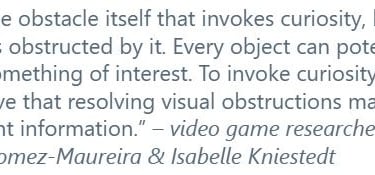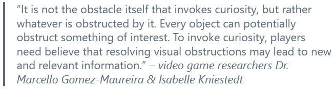What seems to drive curiosity in games is spicing up predictable structure with some uncertainty. Like obstacles.