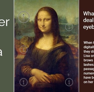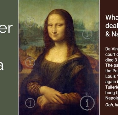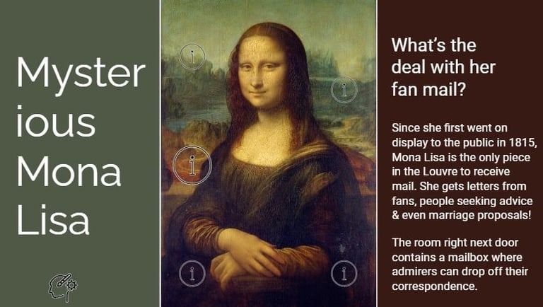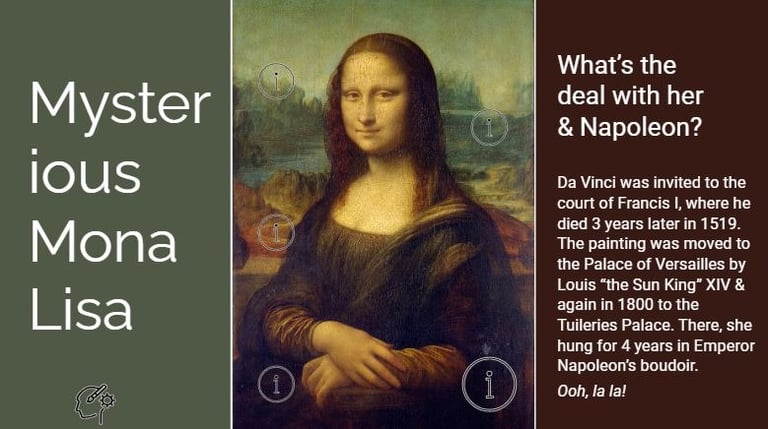 To present a number of fun facts about the world's most famous painting in a way that avoids cognitive overload by splitting up the text into much smaller chunks. Showing just the "information" icons evokes curiosity, inviting the learner to click on each to learn more - which makes this infographic much more engaging for the learner.