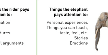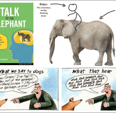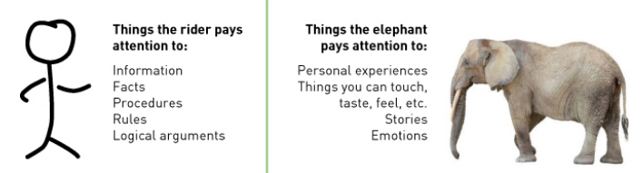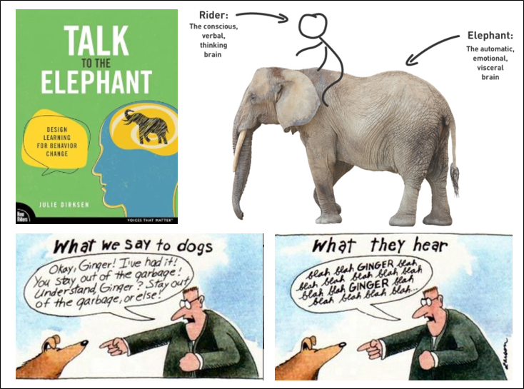 In her book Talk to the Elephant: Design Learning for Behavior Change (New Riders | Pearson Education; 2024), she likens our decision-making making machinery to an elephant and a rider. Our rider is rational. Plans for the future. Sticks to the diet. Goes to the gym as planned. Adults.