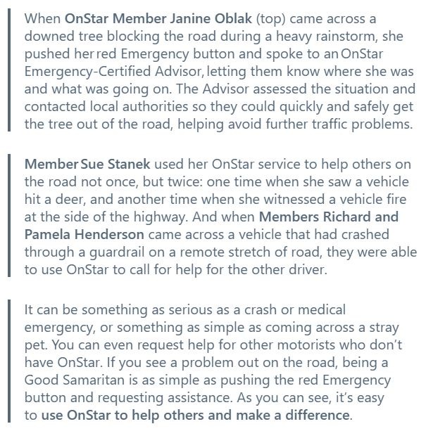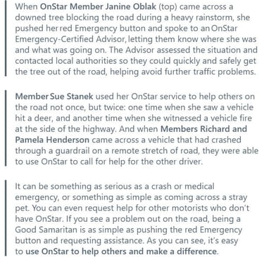 Obviously these OnStar testimonials are one big ole' sales pitch. But they still work. These stories pull us in. Entice us to keep reading. And tap into the secret sauce that makes a learning experience effective: motivation.