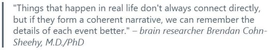 Narrative is like a memory magnet for your hippocampus, your brain’s very own personal storyteller. It weaves tales – tall and otherwise – to shuttle info from short-term into long-term memory,