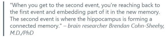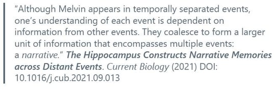 When the Melvin & Beatrice researchers had the subjects recall what they remembered, fMRI of patterns of activity in the hippocampus revealed that a much greater degree of learning occurred when there was a causal event – a context - into which memories of resulting events could be embedded.